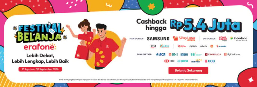 Bertajuk “Festival Belanja erafone”, acara ini menawarkan berbagai penawaran menarik kepada konsumen, termasuk promo spesial yang disediakan oleh Akulaku Finance untuk memudahkan pembelian gadget dan elektronik. Acara ini berlangsung selama satu bulan penuh yang dimulai dari tanggal 15 Agustus 2024 hingga 30 September 2024 mendatang.