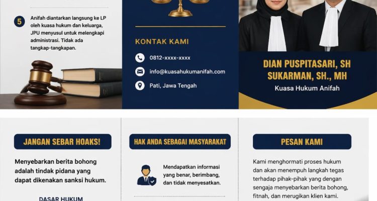 MokiNews.com, PATI – Kuasa hukum Anifah, Dian Puspitasari, SH dan Sukarman, SH., MH, secara tegas membantah kabar yang menyebut kliennya masuk dalam Daftar Pencarian Orang (DPO) Kejaksaan Negeri (Kejari) Pati.